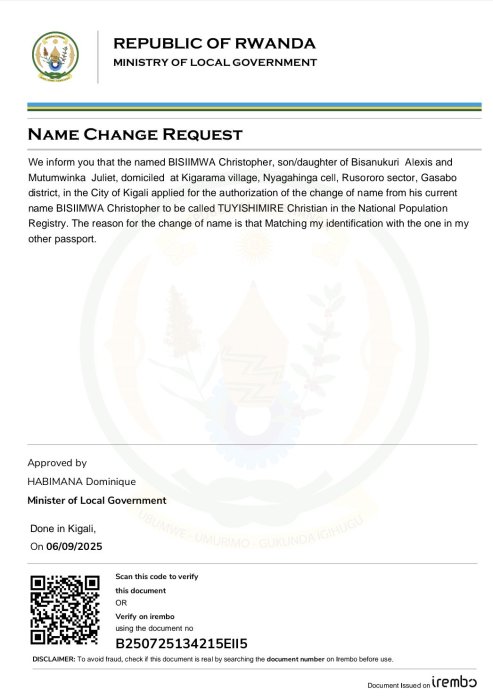 Uwitwa BISIIMWA Christopher yasabye guhindura amazina mu buryo bwemewe n’amategeko akitwa TUYISHIMIRE Christian mu bitabo by’irangamimerere.