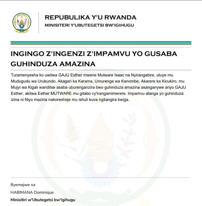 Turamenyesha ko Uwitwa Gaju Esther mwene Mutware Isaac na Nyirangabire, ashaka guhindurirwa izina akitwa Ester Mutware.