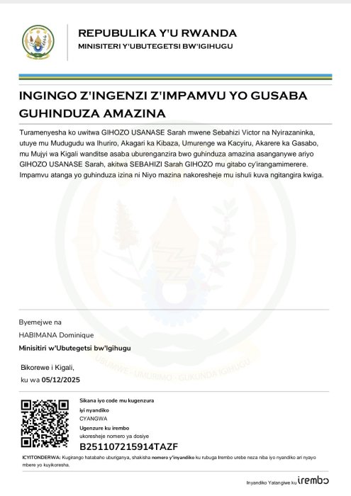 GIHOZO USANASE Sarah yasabye guhindura amazina akitwa SEBAHIZI Sarah GIHOZO mu bitabo by’irangamimerere!