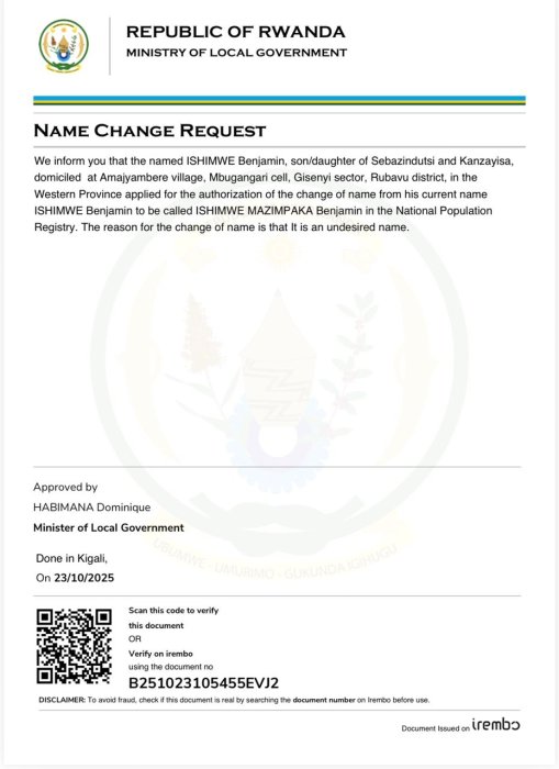 ISHIMWE Benjamin yasabye guhindura amazina mu buryo bwemewe n’amategeko akitwa ISHIMWE MAZIMPAKA Benjamin mu bitabo by’irangamimerere!