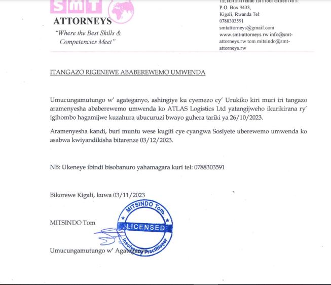Umucungamutungo w’agateganyo, ashingiye ku cyemezo cy’Urukiko kiri muri iri tanganzo aramenyesha ababerewemo umwenda ko ATRAS Logistics Ltd yatangijweho ikurikiranwa ry’igihombo hagamijwe kuzahura ubucuruzi bwayo guhera tariki ya 26/10/2023