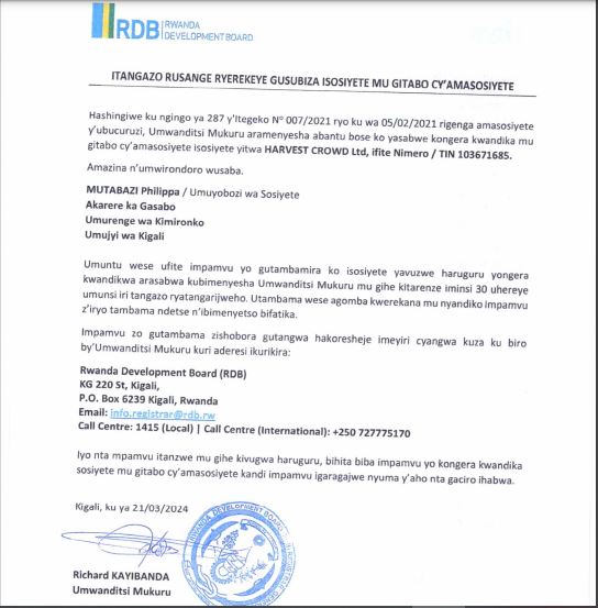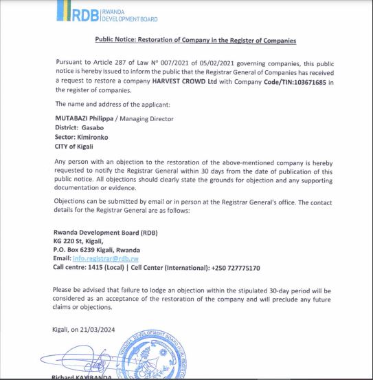 Hashingiwe ku ngingo ya 287 y’itegeko No 007/2021 ryo kuwa 05/02/2021 rigenga amasosiyete y’Ubucuruzi,Umwanditsi mukuru aramenyesha abantu bose ko yasabwe kongera kwandika mu gitabo cy’Amasosiyete Isosiyete yitwa Havest Crowd Ltd ifite Numero/TIN 103671685