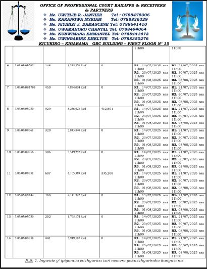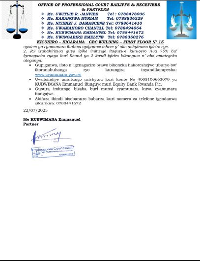 Umuhesha w’inkiko w’umwuga aramenyesha ko azagurisha muri cyamunara imitungo itimukanwa iherereye mu karere ka Rubavu