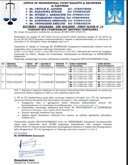 Umuhesha w’inkiko w’umwuga aramenyasha abantu bose ko hatazangizwa ipiganwa muri cyamunara y’umutungo utimukanwa iherereye mu karere ka GISAGARA