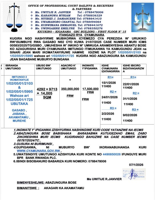 Umuhesha w’inkiko w’umwuga aramenyesha abantu bose ko hateganyijwe ipiganwa muri cyamunara y’imutungo itimukanwa ya KAMUGUNDU JEAN na SINARI JEAN MARI