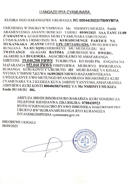 Umuhesha w’inkiko w’umwuga aramenyasha abantu bose ko hatazangizwa ipiganwa muri cyamunara y’umutungo utimukanwa iherereye mu karere ka BUGESERA
