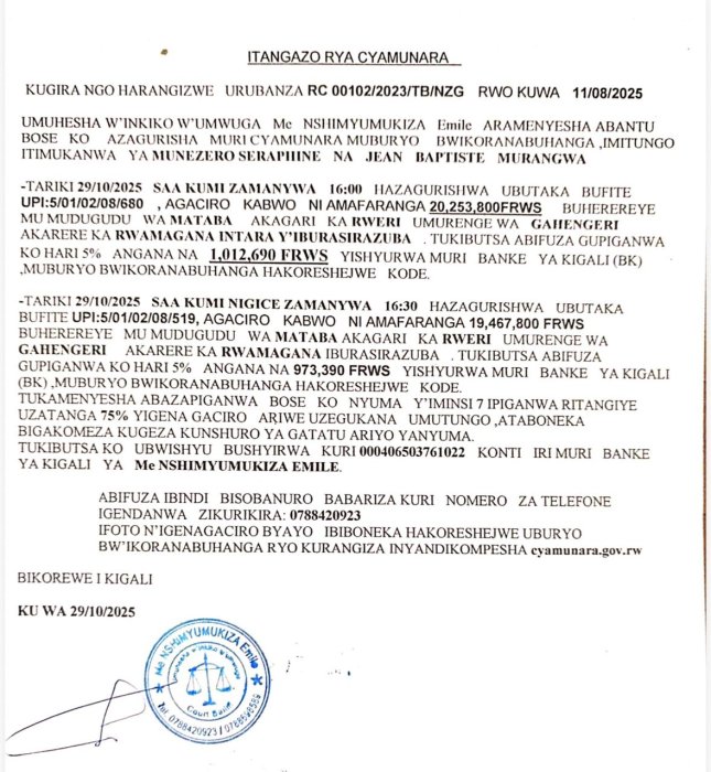 Umuhesaha w’inkiko w’umwuga Me NSHIMIYUMUKIZA Emile aramenyesha abantu bose ko hateganyijwe ipiganwa muri cyamunara y’umutungo utimukanwa uherereye mu karere ka Rwamagana