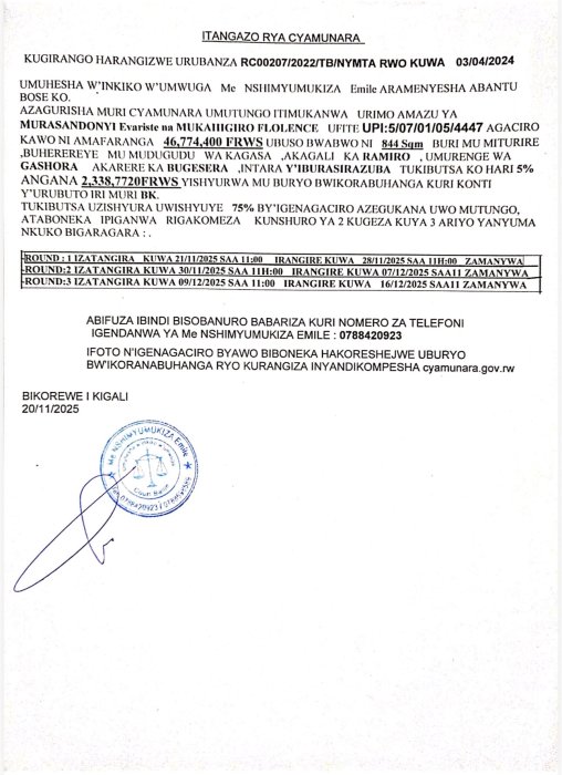 Umuhesaha w’inkiko w’umwuga Me NSHIMYUMUKIZA Emille aramenyesha abantu bose ko hateganyijwe ipiganwa muri cyamunara y’umutungo utimukanwa uherereye mu karere ka BUGESERA