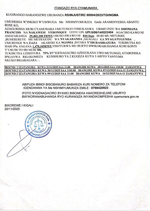 Umuhesaha w’inkiko w’umwuga Me NSHIMYUMUKIZA Emile aramenyesha abantu bose ko hateganyijwe ipiganwa muri cyamunara y’umutungo utimukanwa uherereye mu karere ka Ngoma.