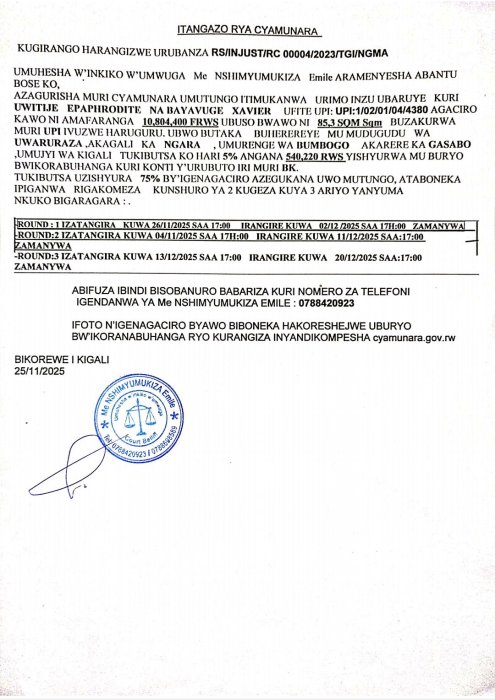 Umuhesaha w’inkiko w’umwuga Me NSHIMYUMUKIZA Emile aramenyesha abantu bose ko hateganyijwe ipiganwa muri cyamunara y’umutungo utimukanwa uherereye mu karere ka Gasabo.