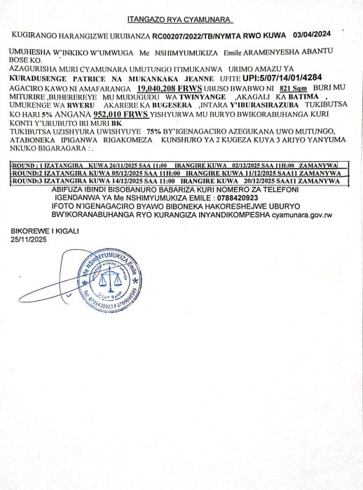 Umuhesaha w’inkiko w’umwuga Me NSHIMYUMUKIZA Emile aramenyesha abantu bose ko hateganyijwe ipiganwa muri cyamunara y’umutungo utimukanwa uherereye mu karere ka Bugesera.