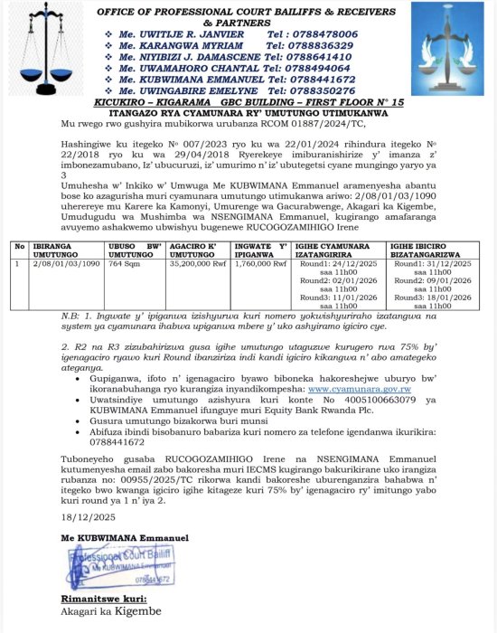 Umuhesaha w’inkiko w’umwuga aramenyesha abantu bose ko hateganyijwe ipiganwa muri cyamunara y’umutungo utimukanwa.
