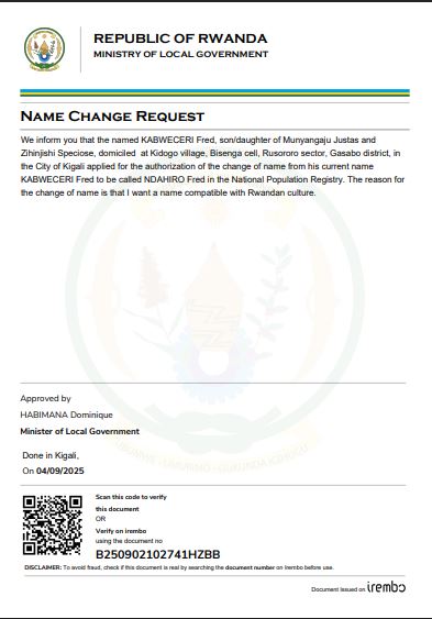 Uwitwa KABWECERI Fred yasabye guhindura amazina mu buryo bwemewe n’amategeko akitwa NDAHIRO Fred mu bitabo by’irangamimerere!