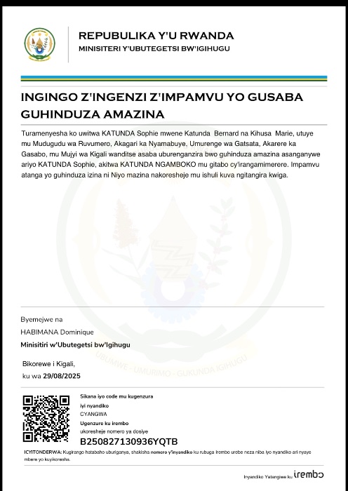 Turamenyesha ko uwitwa KATUNDA Siphie yasabye guhindurirwa amazina akitwa KATUNDA NGAMBOKO mu gitabo cyirangamimerere.