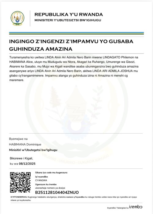 LINDA Alvin Ari Admilla Nero Barin yasabye guhindura amazina akitwa LINDA ARI ADMILA JOSHUA