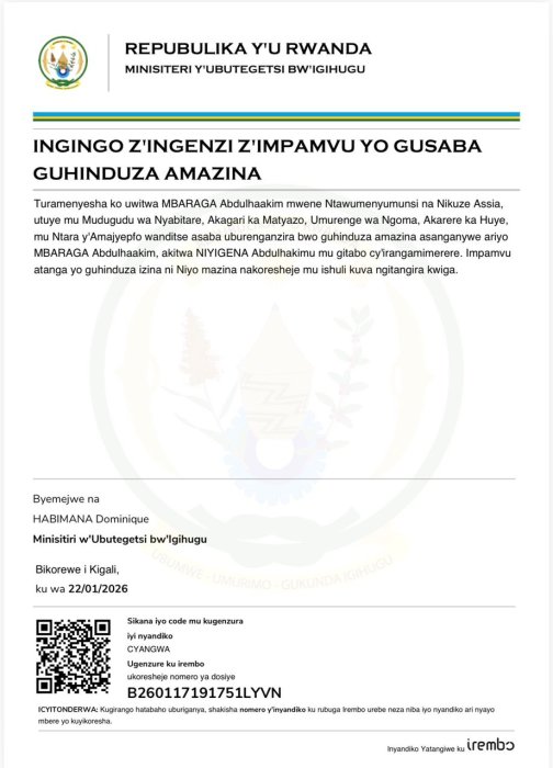 MBARAGA Abdulhaakim yasabye guhindurirwa amazina akitwa NIYIGENA Abdulhakimu