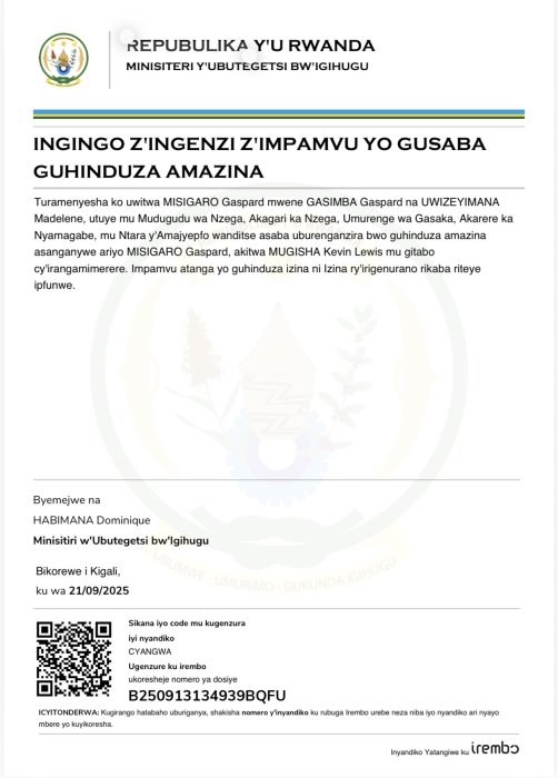 MISIGARO Gaspard yabye guhindurirwa amazina mu buryo bwemewe n’amategeko akitwa MUGISHA Kevin Lewis mu bitabo by’irangamimerere!