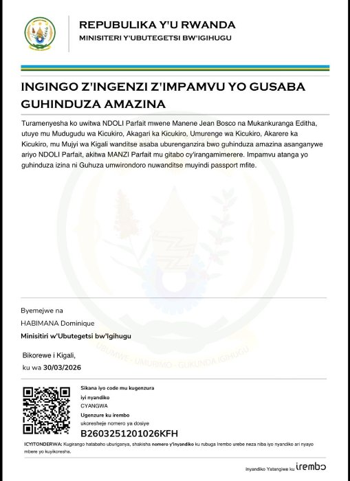 NDOLI Parfait yasabye guhindurirwa amazina kaitwa MANZI Parfait mu bitabo byiraga imerere.