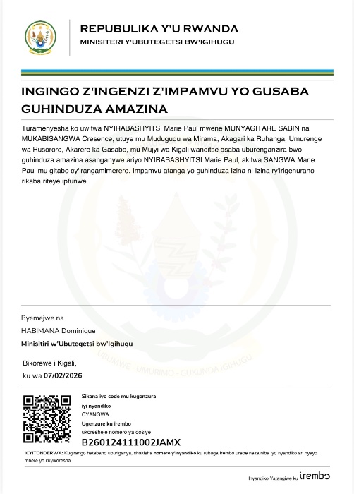 NYIRABASHYITSI Marie paul yasabye guhindurirwa amazina akitwa SANGWA Marie paul mu gitabo cyirangamimerere.