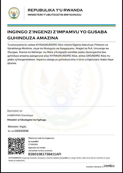 NYIRAGIKUNDIRO Alice yasabye guhindurirwa amazina akitwa GIKUNDIRO Alice mu gitabo cyirangamimerere.