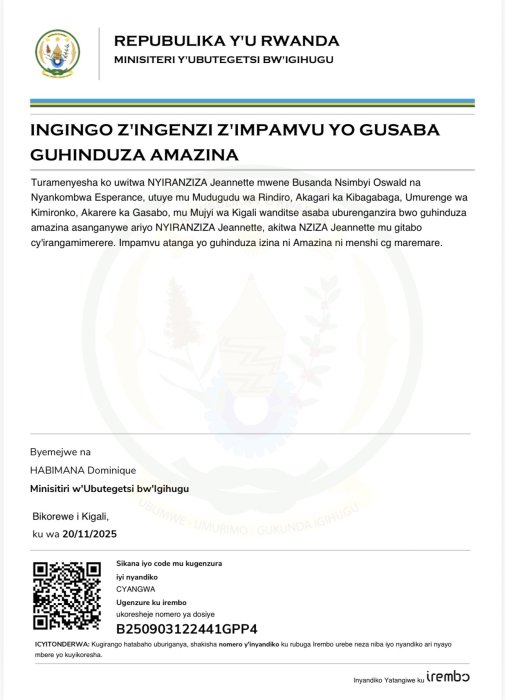 NYIRANZIZA Jeannette yasabye guhindura amazina akitwa NZIZA Jeannette mu bitabo by’irangamimerere!