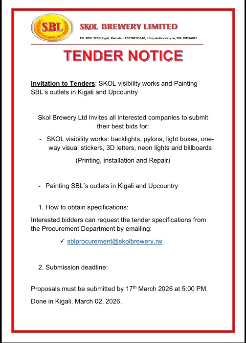 Tender Notice for SKOL visibility works and Painting SBL’s outlets in Kigali and Upcountry