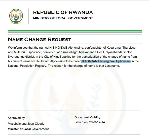 Uwitwa NISINGIZWE Alphonsine yasabye guhindura amazina akitwa KAGARAMA Nisingizwe Alphonsine