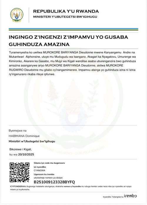 MUROKORE BARIYANGA Dieudonne yasabye guhindura amazina akitwa MUROKORE RUGWIRO Dieudonne