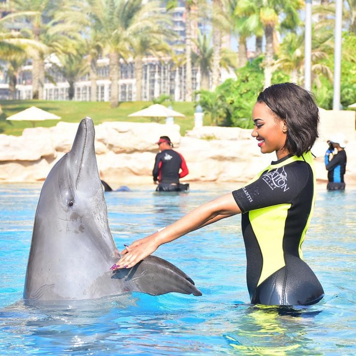 Umunyadushya ShaddyBoo yashyize hanze amafoto yagiye gutemberera kuri Atlantis mu gace kitwa The Palmah nkuko bigaragara ku ifoto ye ari kumwe n’igifi kinini bimwe bizwi nka Dolphins.