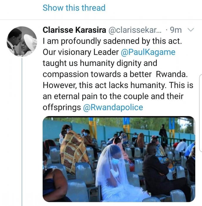 Yavuze ko Polisi ikwiye kurangwa n’ubumuntu nk’uko Perezida Paul Kagame ahora abitoza kugira ngo Abanyarwanda bagire igihugu cyiza. Ati “Nashenguwe n’iki gikorwa. Perezida Paul Kagame ahora atwigisha ubumuntu no kugira impuhwe kugira ngo tugire igihugu cyiza. Gusa iki gikorwa nta bumuntu burimo. Aka ni agahinda kazahoraho kuri aba bashakanye n’abazabakomokaho.” Polisi y’u Rwanda yasubije uyu muhanzikazi iti "Buri muntu agomba kubaha ingamba zo kwirinda Covid-19 ntakuvangura".