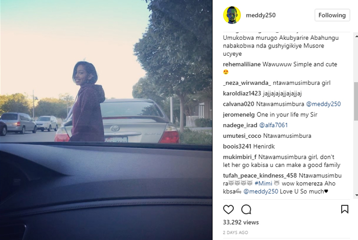 Nyuma Meddy akaba yarafashe amashusho y’uyu mukobwa aturuka imbere y’imodoka yarimo maze abaza abafana be niba koko uyu mukunzi we ashobora gutwara iyo modoka.Nk’uko bigaragara uyu mukobwa yari yambaye umupira w’imbeho,inkweto zigezweho za Snakers ndetse na Telefone ya Smart Phone hamwe na Ukuteri (Izi bumviraho muzika uzishyize mu matwi).