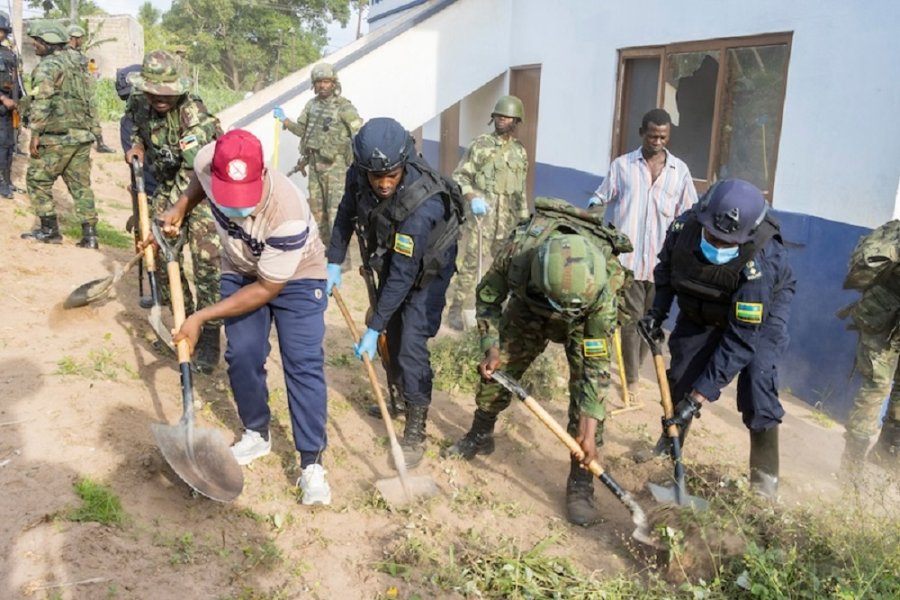 Abasirikare n’Abapolisi b’u Rwanda bari mu butumwa bwo kugarura amahoro muri Mozambique mu Ntara ya Cabo Delgado bifatanyije n’abaturage b’iki gihugu mu gikorwa cy’umuganda.