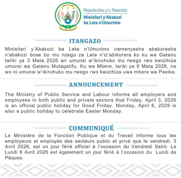 Minisiteri y’Abakozi ba Leta n’Umurimo yatangaje ko ku wa Gatanu, tariki ya 3 Mata 2026 no ku wa Mbere, tariki ya 6 Mata 2026 ari iminsi y’ikiruhuko rusange, mu rwego rwo kwizihiza Umunsi Mukuru wa Pasika.