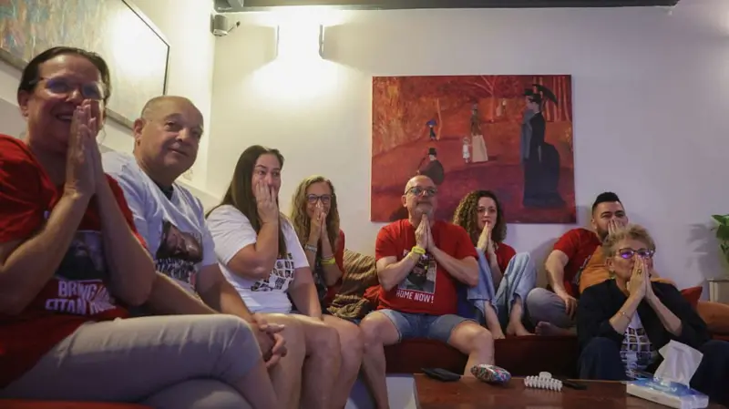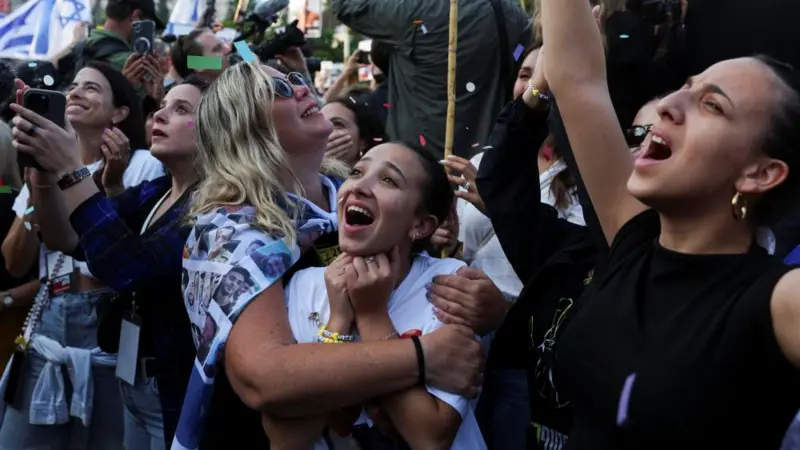 Ibyishimo byari byose mu Mujyi wa Tel Aviv, aho abantu ibihumbi bari bateraniye hamwe bakurikirana kuri ‘ecran’ nini igihe televiziyo zo muri Israel zatangazaga ko abo baturage bageze mu maboko ya Croix-Rouge.