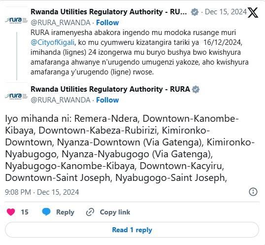 RURA yatangaje ko guhera kuri uyu wa Mbere tariki 16 Ukuboza, ibyerekezo (lignes) 24 bikoreramo imodoka zitwara abagenzi mu mujyi wa Kigali, bizongerwa mu buryo bushya bwo kwishyura amafaranga ahwanye n’urugendo umugenzi yakoze