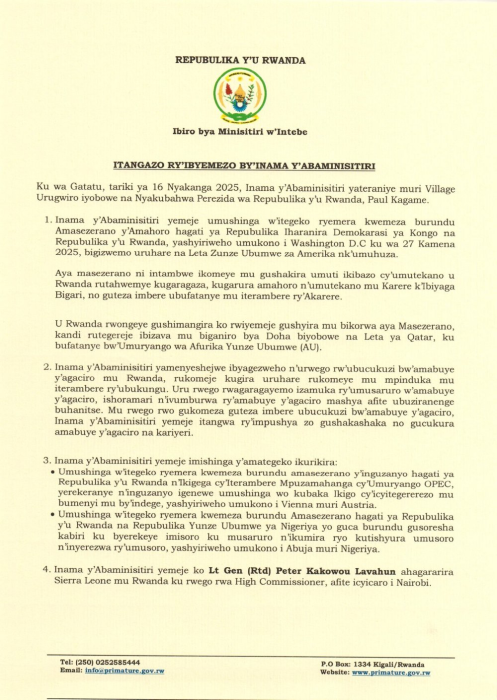 Inama yateranye kuri uyu wa 16 Nyakanga 2025 muri Village Urugwiro iyobowe na Perezida Kagame, yemeje umushinga w’itegeko ryemera kwemeza burundu Amasezerano y’Amahoro hagati ya Repubulika Iharanira Demokarasi ya Congo na Repubulika y’u Rwanda, yashyiriweho umukono i Washington D.C ku wa 27 Kamena 2025, bigizwemo uruhare na Leta Zunze Ubumwe za Amerika nk’umuhuza.