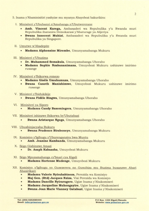 Muri Ministeri y’Ibidukikije, Fidèle Bingwa, yagizwe Umunyamabanga Uhoraho. Muri Minisiteri ya Siporo, Candy Basomingera, yagizwe Umunyamabanga Uhoraho. Basomingera yari asanzwe ari Umuyobozi Mukuru Wungirije w’Ikigo cy’Igihugu gishinzwe guteza imbere ubukerarugendo bushingiye ku nama (RCB).