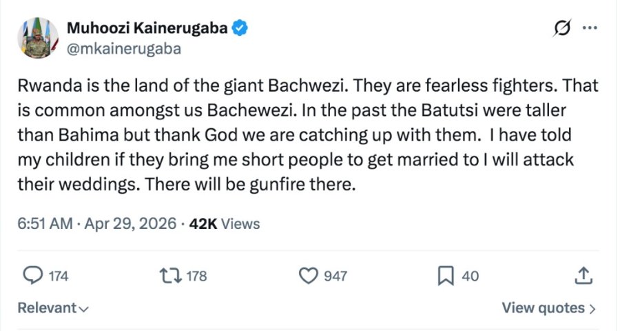 General Muhoozi, umuhungu wa Perezida Yoweri Kaguta Museveni wa Uganda, akaba ari na we mfura ye, yatangaje ibi mu butumw ayanyujije ku rubuga nkoranyambaga rwa X, akunze kwisanzuraho agatanga ibitekerezo binyuranye rimwe na rimwe ntibinavugweho rumwe.