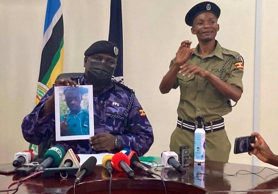 Uwahoze ari Umuvugizi wa Polisi ya Uganda, Fred Enanga, ubwo yatangazaga ko Meddie Nkalubo yishwe