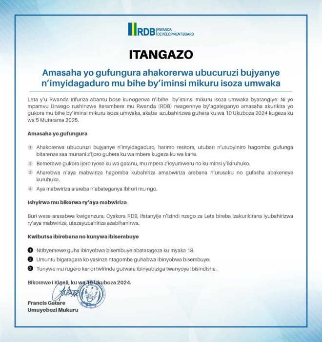 Mu itangazo RDB yashyize hanze, yavuze ko iki cyemezo gitangira gukurikizwa kuva kuri uyu wa 10 Ukuboza 2024, kugeza tariki 5 Mutarama 2025.