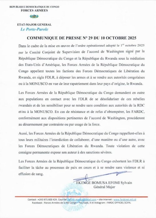 Umuvugizi w’ingabo za Repubulika ya Demukarasi ya Congo witwa Général-Major Sylvain Ekenge yemeza ko igisirikare avugira cyategetse abarwanyi ba FDLR aho bari hose ko bose bishyikiriza ubuyobozi bw’ingabo habegereye.