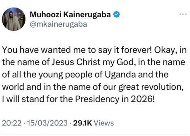 Muhoozi yari yanditse ati: “Iteka ryose mwifuje ko mbivuga!...Nziyamamariza kuba Perezida mu 2026”.