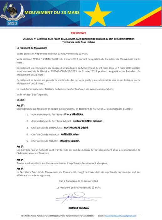 Abashyizweho ni abakuriye Teritwari ya Rutshuru ubu igenzurwa n’uyu mutwe w’inyeshyamba, hamwe n’abakuriye centre/cites za Bunagana, Kiwanja na Rubare zo muri Rutshuru.