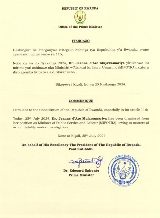 RIB yatangaje ko MUJAWAMARIYA Jeanne d’Arc akurikiraho ibyaha yakoze akiri Minisitiri w’Ibidukikije. Ni nyuma y’uko Perezida wa Repubulika yirukanye uwari Minisitiri w’Abakozi ba Leta n’Umurimo, Dr Mujawamariya Jeanne D’Arc kubera ibyo akurikiranyweho kuri uyu wa Kane taliki ya 25 Nyakanga 2024.