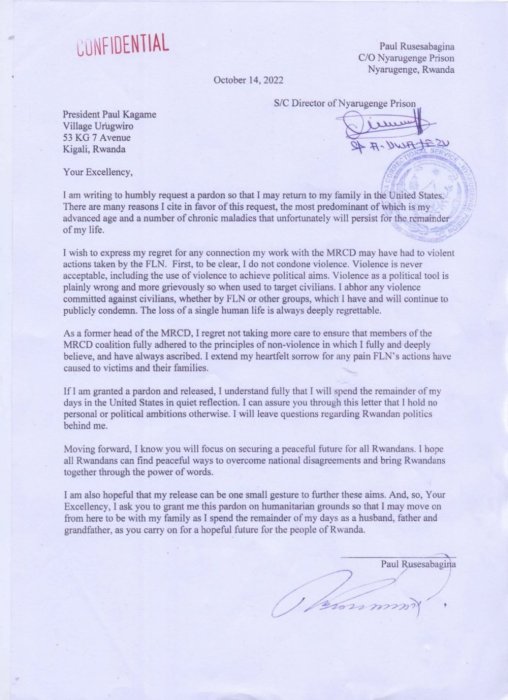 Iyi niyo baruwa Rusesabagina yanditse asaba imbabazi, Yanditswe mu Cyongereza, hano yashyizwe mu Kinyarwanda