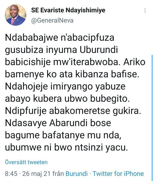 Yagize ati : "Ndababajwe n’abacipfuza gusubiza inyuma Uburundi babicishije mw’iterabwoba. Ariko bamenye ko ata kibanza bafise. Ndahojeje imiryango yabuze abayo kubera ubwo bubegito. Ndipfurije abakomeretse gukira. Ndasavye Abarundi bose bagume bafatanye mu nda, ubumwe ni bwo ntsinzi yacu."
