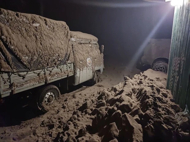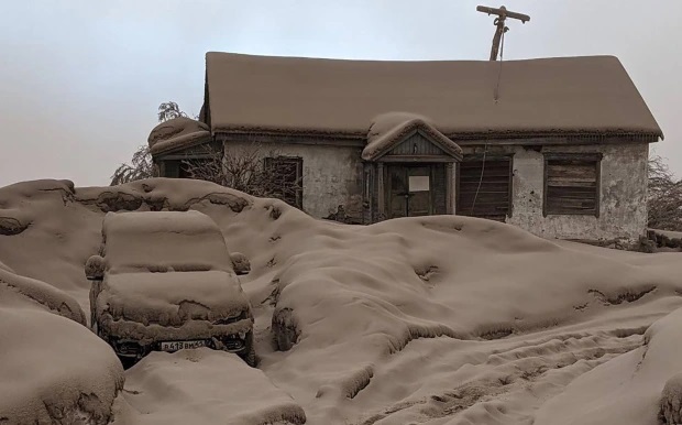 Umudugudu watwikiriwe n’vu ry’ikirunga cya Shiveluch.Hari umwijima,nta kintu wabona."