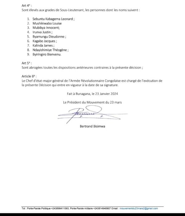 Nk’uko bigaragara mu itangazo Bisimwa yashyizeho umukono, Colonel Gacheri Musanga Justin yazamuwe ku ipeti rya Brigadier Général, Lieutenant Colonel Nsanze Nzamuye na Karangwa Bihire Justin bazamurwa ku rya Colonel.