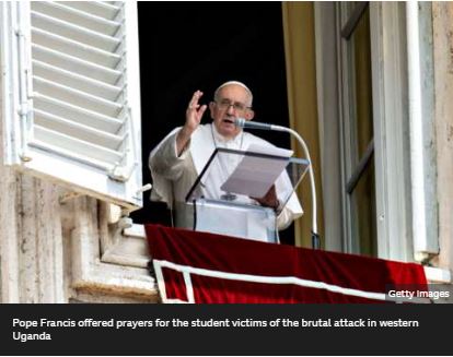 Umushumba wa kiriziya Gatorika ku isi Pope Francis, yayoboye igitambo cya missa ku kicaro gikuru cya Kiliziya I Vaticani, asaba abitabiriye kwerekeza isengesho ryabo ku bana b’abanyeshuri bishwe mu gitero cyibasiye ishuri muri Uganda