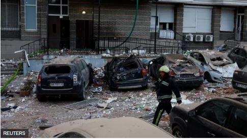Abategetsi bavuga ko ibisigazwa by’ibisasu ari byo byateje uwo muriro, ubwo ubwirinzi bw’ikirere bwa Ukraine bwahanuraga indege nto zitarimo umupilote (zizwi nka drone) zirenga 20. Nibura umuntu umwe byatangajwe ko yapfuye.